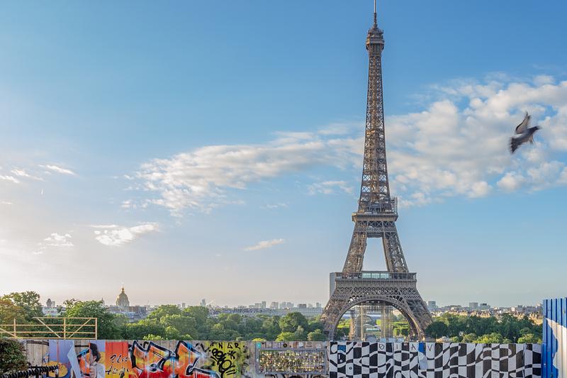 Landscape view of Paris with the Eiffel Tower as the star with a bird flying through taken from Trocadéro Square