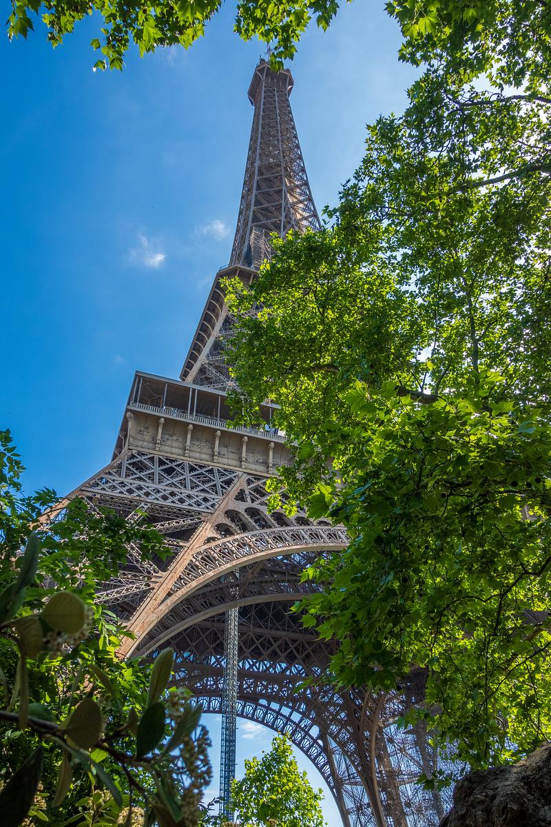 Looking up at the Eiffel Tower through the trees